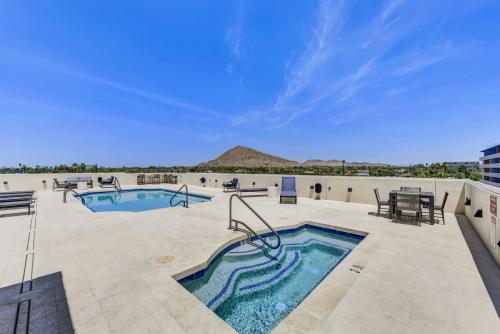 Wake up to PANORAMIC MOUNTAIN VIEWS in this Luxurious 5th-floor residence at the prestigious Mark Condo Building! Perfectly situated in the heart of the Historic Old Town Scottsdale Arts District this highly desired living is designed for those who value both elegance & experience. This Beautifully Remodeled 2 Bedroom & 2 Bath home offers an effortless blend of luxury and comfort. The Gourmet Kitchen was Partially Remodeled in 2021, features Upgraded Cabinetry, White Granite Countertops, a Walk-In Pantry, Premium Stainless Steel Appliances including a Viking Gas Range and GE Monogram Refrigerator ideal for entertaining or quiet evenings in. Spa-inspired Bathrooms, Travertine and Luxury Vinyl plank flooring, designer lighting, All New Ceiling Fans, and a Tiled patio create a sophisticated retreat. Just steps from world-class shopping, dining, art, and nightlife. Enjoy breathtaking panoramic views of the Superstition Mountains and Four Peaks by day and dazzling Scottsdale city lights by night from this exceptional residence at The Mark. Residents are pampered with daily concierge service, a highly secure building with state-of-the-art building security, a Secure Underground parking garage, and Two Reserved parking spaces. The Mark features a Fully Remodeled Heated Rooftop Pool & Spa, as well as a first-class BBQ area. (The Full Remodel of the Rooftop was Completed in 2024) Ownership also includes Full access to the iconic Valley Ho Hotel amenities, featuring room service, a 20% discount at The ZUZU Restaurant and The Valley Ho Spa, plus a 20% discount on guest rooms and suites. The HOA Fee covers A/C & Heat, Electricity, Internet, Water, Security, Concierge services, Lobby Coffee Bar, Building Pest Control, Fitness Center, and all Rooftop amenities. This is true lock-and-leave luxury living in one of Scottsdale's most sought-after and iconic locations.