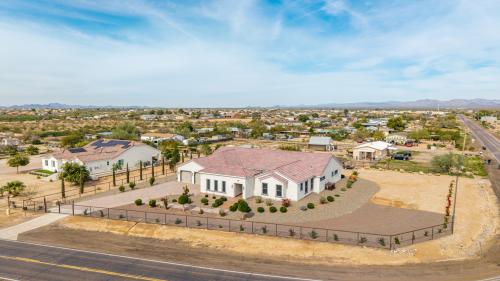 Luxurious Modern Custom Estate on Over ¾ Acre! Experience refined desert living in this impeccably designed modern custom home, perfectly situated on over three-quarters of an acre with unobstructed, serene desert and mountain vistas. Every detail has been thoughtfully curated, from soaring 10-12' ceilings and solid 8' doors to upgraded luxury vinyl plank and designer tile flooring throughout. The expansive open-concept Kitchen and Great Room create an ideal space for both everyday living and grand entertaining. The gourmet kitchen is a showpiece, featuring abundant cabinetry, granite countertops, tile backsplash, top-tier light fixtures, and a massive walk-in pantry. Enjoy both formal and casual dining areas, while dramatic 4-panel sliding doors seamlessly blend indoor and outdoor living. A beautifully tiled fireplace anchors the main living space with warmth and sophistication. The primary suite is a private retreat, offering a spa-inspired bath with a resort-style walk-in shower, separate soaking tub, and a dual-entry walk-in closet that conveniently connects to the oversized laundry room. Two additional en-suite bedrooms each feature walk-in showers, providing comfort and privacy for guests or family. A spacious den with its own courtyard exit offers versatility as a home office, lounge, or optional fourth bedroom. Thoughtful touches continue throughout with refined hall cabinetry, premium finishes, and exceptional craftsmanship. Car enthusiasts and hobbyists will appreciate the extensive parking and flexible garage options, including a long paver driveway, side RV gate, extended-length 2-car garage, and a separate third-car garage with sliding door courtyard access - ideal for a workshop, fitness studio, or car. The fully fenced yard is designed for easy maintenance and maximum enjoyment, featuring desert landscaping, artificial turf, a travertine patio, and elegant paver steps. With ample room to add a pool, RV parking, horse facilities, or create your own custom outdoor oasis, the possibilities are endless. This extraordinary property offers luxury and panoramic natural beauty - an absolute must-see. Furnishings available on a separate bill of sale.