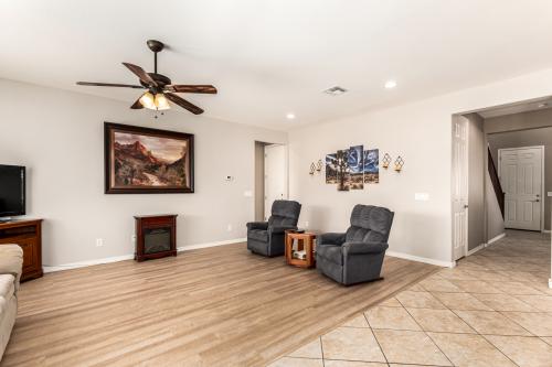 AMAZING 4 BEDROOM, 3 BATH HOME WITH HEATED PEBBLESHEEN POOL! Welcome to your dream home! This stunning property features 4 bedrooms plus a flex space upstairs that can serve as a 2nd loft, den, game room, or converted 5th bedroom. Enjoy low energy costs with leased solar panels—the average electric bill is only around $20/month! Inside, you'll find a bright, open-concept layout with: guest bedroom and full bath downstairs, new luxury vinyl plank flooring, gorgeous kitchen with granite countertops, tile backsplash, upgraded cabinets with crown molding, butler's pantry, high ceilings, upgraded staircase, upstairs laundry room, huge primary suite with two walk-in closets, water softener, R/O system, and extended length garage (26 feet!). Washer/Dryer/Refrigerator included! Step outside to your private backyard oasis featuring a heated, self-cleaning PebbleSheen pool, travertine deck, covered patio, and putting green for fun and relaxation. All this in a prime location near shopping, schools, and freeways! Must see!