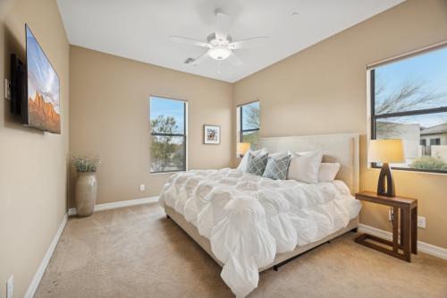 Exquisite 4,858 sq ft estate within the private gated community of Talon Ranch in North Scottsdale, privately positioned and surrounded by NAOS. The home is immersed in the serene Sonoran Desert and offers unobstructed mountain and sunset views of Tom's Thumb, Pinnacle Peak, and the Four Peaks Mountain Range afforded by its unusually high elevation. This impeccably designed residence offers unusual privacy, surrounded by wonderful open space and features 4 bedrooms, 4.5 baths, a private office and bonus/media room and dedicated air conditioned exercise room, delivering both elegance and versatility. Oak wood flooring and wood ceiling and beams in the great room provide a warm ambiance. The chef's kitchen is exceptionally appointed with extensive custom cabinetry, Sub-Zero side by side fridges, ice maker, Wolf double ovens, gas cooktop, and Miele dishwasher. The formal dining room is enhanced by two built-in Sub-Zero wine refrigerators and built-in sideboard, ideal for refined entertaining. Storage is abundant throughout the home with thoughtfully designed cabinetry. Comfort and ambiance are elevated with two indoor gas fireplaces, while the home is fully wired with Ethernet, Control 4 and keypads, and Ring security cameras for ease and convenience. Outdoor living is equally impressive, featuring an expansive travertine patio, resort--style pool and spa, built-in gas BBQ, Big Green Egg charcoal grill, outdoor fire pit, and an elevated seating area perfectly positioned for enjoying majestic Arizona sunsets. The upgraded 3-car garage includes epoxy floors, storage cabinets, and a workbench. A rare offering that seamlessly blends luxury, privacy, and iconic desert surroundings