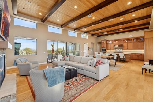 Price Reduced $525K! Great opportunity for this Exquisite 4,858 sq ft estate within the private gated community of Talon Ranch in North Scottsdale, privately positioned and surrounded by NAOS. The home is immersed in the serene Sonoran Desert and offers unobstructed mountain and sunset views of Tom's Thumb, Pinnacle Peak, and the Four Peaks Mountain Range afforded by its unusually high elevation. This impeccably designed residence offers unusual privacy, surrounded by wonderful open space and features 4 bedrooms, 4.5 baths, a private office and bonus/media room and dedicated air conditioned exercise room, delivering both elegance and versatility. Oak wood flooring and wood ceiling and beams in the great room provide a warm ambiance. The chef's kitchen is exceptionally appointed with custom cabinetry, Sub-Zero side by side fridges, ice maker, Wolf double ovens, gas cooktop, and Miele dishwasher. The formal dining room is enhanced by two built-in Sub-Zero wine refrigerators and built-in sideboard, ideal for refined entertaining. Storage is abundant throughout the home with thoughtfully designed cabinetry. Comfort and ambiance are elevated with two indoor gas fireplaces, while the home is fully wired with Ethernet, Control 4 and keypads, and Ring security cameras for ease and convenience. Outdoor living is equally impressive, featuring an expansive travertine patio, resort--style pool and spa, built-in gas BBQ, Big Green Egg charcoal grill, outdoor fire pit, and an elevated seating area perfectly positioned for enjoying majestic Arizona sunsets. The upgraded 3-car garage includes epoxy floors, storage cabinets, and a workbench. A rare offering that seamlessly blends luxury, privacy, and iconic desert surroundings.