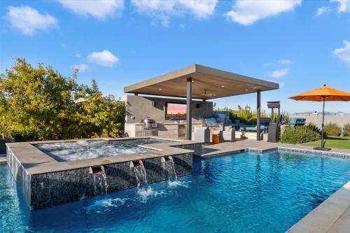 This North Scottsdale residence at Boulder Ranch embodies modern elegance and luxury with the serenity and peacefulness of the Sonoran Desert. A private courtyard welcomes you to an expansive interior with soaring ceilings, custom hardwood shelving. The floor-to-ceiling doors and windows invite in an abundance of natural light. The heart of the home is a chef's kitchen, equipped with waterfall-edge islands, quartz countertops, and high-end appliances, seamlessly blending into the living and dining areas. The primary suite is a private haven with dual walk-in closets, backyard access, and a spa-inspired bathroom featuring a soaking tub, rain shower, and luxury finishes. Additional guest suites and a versatile 1 Bedroom Casita provide ample accommodations for multi-generational living. Outdoor living is elevated with a pool, spa, outdoor kitchen, and heated patios with power shades, creating perfect In-Door, Outdoor Living. The property includes a climate-controlled five-car garage and a Control4 automation system, epitomizing convenience and sophistication. A Truly Breath Taking Residence!!