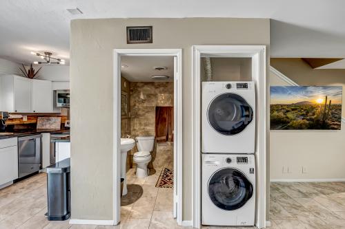 RARE FULL SIZE WASHER DRYER IN UNIT. Beautifully renovated 2 Bedroom 2 FULL Bath townhouse in Camelback House. This unit has been completely remodeled featuring full two bathrooms, tile & carpet flooring, energy efficient windows & sliding glass door, fresh paint, vaulted ceiling in the stairwell, modern chandeliers and LED lighting, NEW AC unit, owned security system, & more. You must see this unit to appreciate all the effort that went into this project. Within walking or biking distance to the world renowned Shops at Scottsdale Fashion Square, multiple Casual & Fine Dining Experiences, Scottsdale Waterfront, Old Town Scottsdale and Camelback Mountain Hiking, Scottsdale Art Walk, Spring Training and so much more. HOA allows short term rentals making this unit a great investment property! Seller offering flooring credit for carpet upstairs.