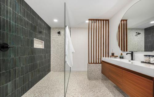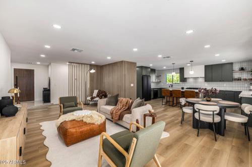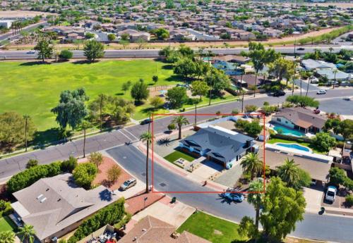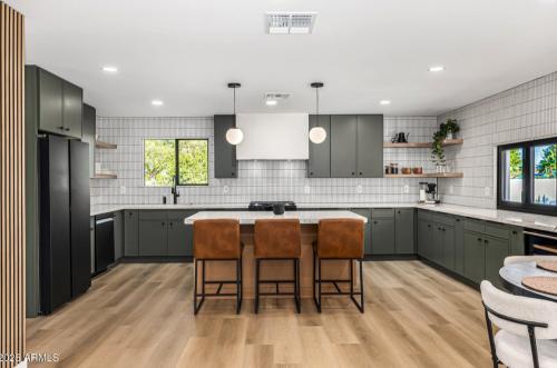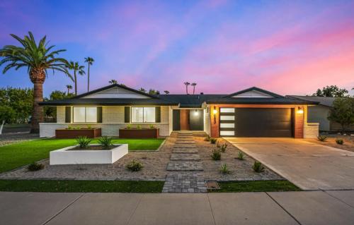 Discover mid-century charm in this fully permitted, top-to-bottom remodel! 4-bed, 2-bath home in the coveted Litchfield Park Proper. Premium corner lot adjacent to a serene park, with exceptional curb appeal, manicured artificial turf landscape, and 2-car garage. Inviting open floor plan boasts a chef's kitchen: slim shaker cabinets, terrazzo quartz counters, designer black appliances, accordion window with bar seating for outdoor entertaining. Split primary suite offers patio access, walk-in closet, and lavish ensuite. Expansive backyard includes covered patio/pergola and tiled flagstone seating. New AC, roof, ducts, main sewer line, water heater! Partially new wiring and water lines!