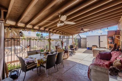 Spacious, rare property is walking distance to State Farm Stadium and perfect for entertaining! Permitted addition makes it the largest home in the neighborhood. No HOA! RV Gate & plenty of paved parking area. 2.5 baths and 4 bedrooms plus unexpected bonus room that could be a den, playroom, or office! Primary bedroom is HUGE with lots of extra room & tons of closet space. Eat-in-Kitchen is comfortable with a large island, plenty of storage, large pantry & newer appliances. Formal Dining room has decorative features that make the space truly one-of-a-kind. Backyard has everything you could wish for: huge shed for projects, built-in barbecue, extended covered patio, garden area & fenced pool area! Your guests will love the pool's large baja step, seating and colored lights & water feature.