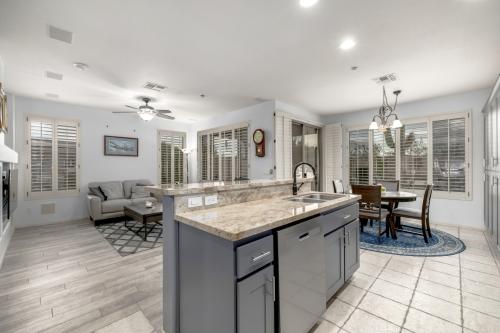 Welcome to this beautifully updated 3-bedroom, 2-bath home located in the highly sought-after gated Anthem Country Club, where country club living meets serene desert beauty. Step inside to find an inviting open layout enhanced by high ceilings and plantation shutters throughout. The elegant see-through fireplace adds warmth and charm to both the living, family room and dining spaces. *Floor Yr Updated 2020, Heating/Cool Yr Updated: 2018, Fully updated Kitchen in 2023* The gourmet kitchen is a true highlight with new cabinets, beautiful granite countertops, stainless steel appliances. Step outside to your own private desert oasis that backs to a desert wash with a covered patio, extended paver patio, tranquil 15-ft water feature, and sweeping desert and mountain views an ideal setting for relaxing evenings or hosting guests.
