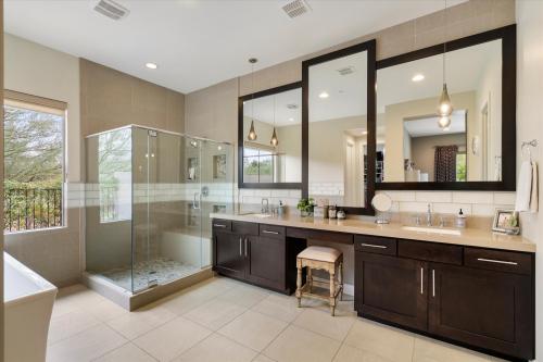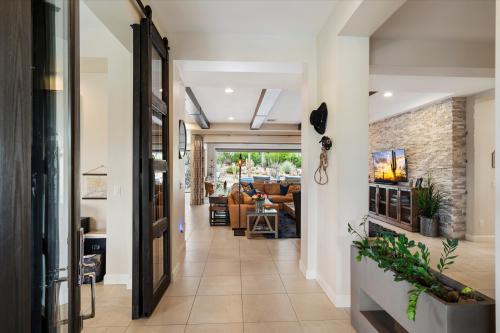 Discover Move-In-Ready Luxury in Carefree, AZ This stunning entertainer's dream, located in the gated Reserve at Tranquil Trail, offers panoramic mountain views and epitomizes modern luxury blended with desert resort-style living. This custom-built residence, completed in 2015, is perfect for buyers seeking a refined and sophisticated lifestyle. Step inside to find a gourmet kitchen equipped with high-end appliances, custom cabinetry, and an impressive waterfall island. The open-concept great room showcases elegant wood beams, a stacked-stone entertainment wall, and a remarkable 14-foot folding glass door that seamlessly connects indoor and outdoor living spaces. The primary suite features dual walk-in closets and is thoughtfully separated from the two guest rooms for privacy.